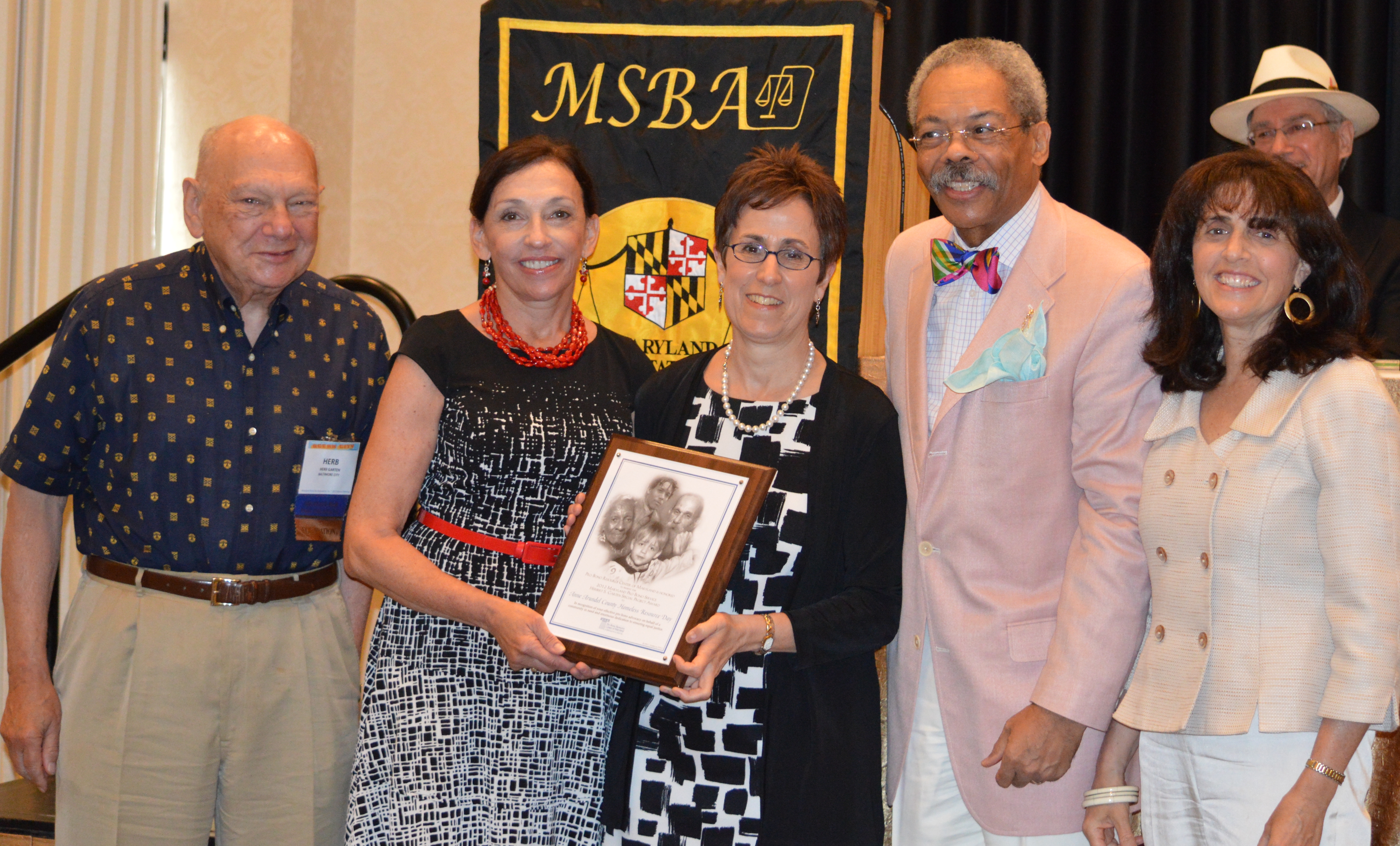 The Anne Arundel County Homeless Resource Day received the 2012 Herbert S. Garten Special Project Award on June 16, 2012 during the business meeting of the Maryland State Bar Association. The award was presented to Chris Poulsen, Program Manager Community Initiatives Unit, Coordinator Homeless Resource Day of the Anne Arundel County Department of Social Services by Chief Judge Robert M. Bell, Herb Garten and Sharon Goldsmith, Executive Director of the Pro Bono Resource Center. Joan Bellistri, Local Pro Bono Chair and Law Library Director, attended.